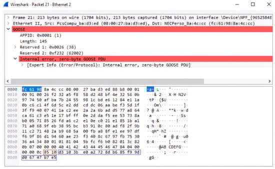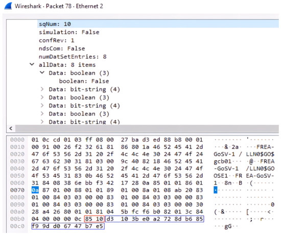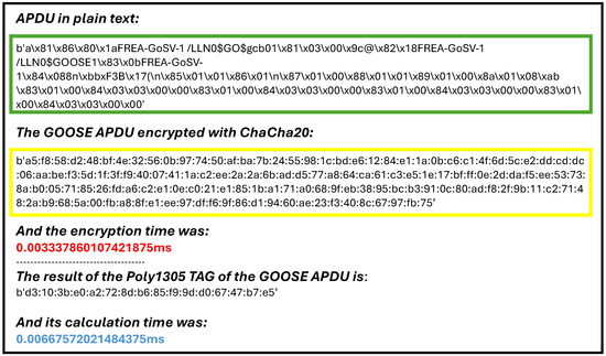 Figure 15 shows the GOOSE frame received on the network with its APDU encrypted using ChaCha20 and the Poly1305 MAC TAG of the GOOSE APDU. It can be seen that the content of the APDU is completely unreadable due to the encryption of the APDU, achieving the confidentiality of the GOOSE message. The MAC TAG of the GOOSE APDU can also be seen in a blue box.
