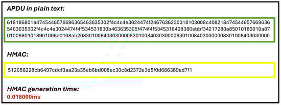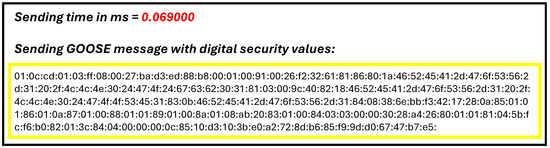 To observe and compare the calculation times of Poly1305 with HMAC-SHA256, the calculation of HMAC-SHA256 is performed with the same virtual machine that generated the Poly1305 MAC and the calculation time of the authors of [31] is also added. Figure 13 shows the APDU MAC calculated with HMAC-SHA256. It can see that the calculation time of the algorithm is 0.018 ms. Table 3 displays the timings obtained solely through digital security measures intended for verifying the authenticity and integrity of GOOSE messages. It includes a comparison between the results obtained using HMAC-SHA256 in this study and those reported in [31] (third row of the table).