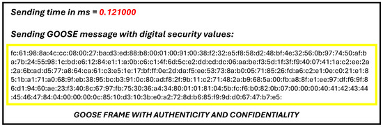 Subsequently, the GOOSE frame is tested with security measures for authenticity, but now also with respect to confidentiality. Figure 14 shows the sending of the GOOSE frame with assurance of authenticity and confidentiality, encrypting the GOOSE APDU and generating its MAC (APDU in plain text) through ChaCha20 and Poly1305.