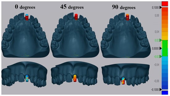 The accuracy analysis was performed using a specific reverse engineering software program (Geomagic Control X, v. 2020, 3D Systems, Rock Hill, SC, USA). The STL file from which all the models of the different groups to be evaluated were printed was the reference model with which the discrepancies of the experimental group files were measured. First, the reference STL was imported, and the mesh area corresponding to the scan body surface was selected. Subsequently, the experimental STL was imported. It was automatically superimposed by the best-fit alignment method, and the mesh area of the scan body surface was selected and compared with the reference one. A color map was obtained from the 3D comparison of the selected area (Figure 3). This process was carried out on each of the STLs of each of the 0-, 45-, and 90-degrees groups. The 3D root mean square (RMS) deviation values were obtained in millimeters (mm).