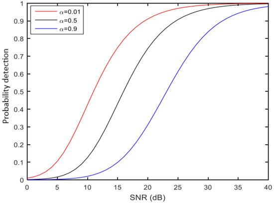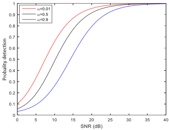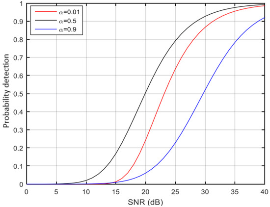 The following figures (Figure 3, Figure 4 and Figure 5) show the simulation results of the probability of detection as a function of the signal-to-noise ratio (SNR) and the coefficient α for different false alarm probabilities.