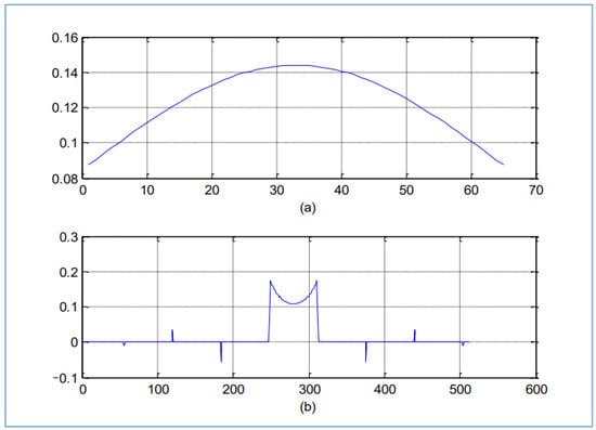 (a) Analysis window h in time, (b) Synthesis window in time, with Nh = 64 and α = 1.