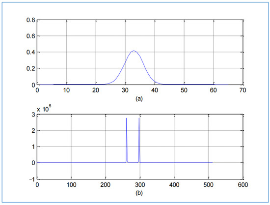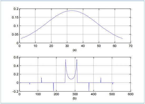 (a) Analysis window h in time, (b) Synthesis window in time, with Nh = 64 and α = 10.