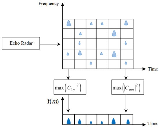 Once the Gabor coefficients are calculated, again consider the squared modulus of the Gabor coefficients from Equation (12), and by projection on the time axis, as shown in Figure 10, we calculate the maximum instantaneous frequency of the frequency sample (n) for each temporal sample (m). Finally, we preserve these instantaneous powers (m) in an energy vector Y as follows: