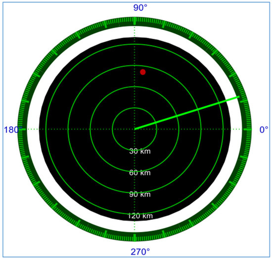 First, we simulated the two targets very close in distance (they are in the same resolution cell) and in the absence of clutter such that the OS-CFAR detector alone cannot distinguish them. In the second case, each target is simulated in a separate resolution cell. As shown in Figure 13, the target spot in red is shown on the panoramic display of our radar system (Plan Position Indicator PPI).