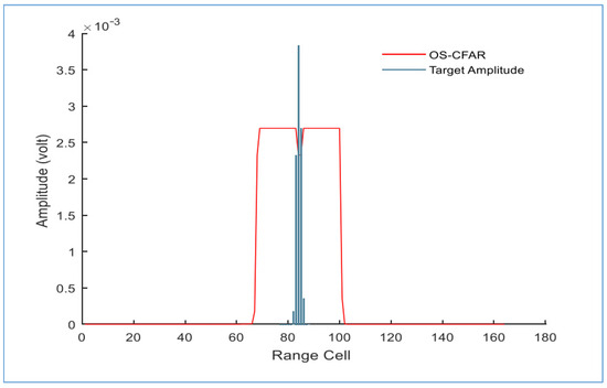 In Figure 14, we have the OS-CFAR detector and the target amplitude where it can be observed that there is one target amplitude that goes above the limit of the detector at around 84km, allowing the target to be detected. It goes along with the position of the target displayed by the PPI (Figure 13), showing the target at approximately the same position.