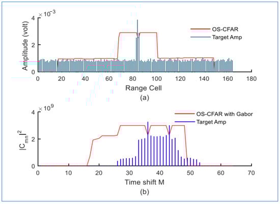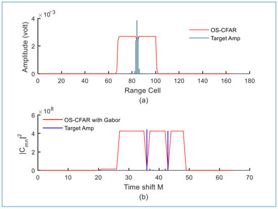 Targets simulated without clutter using (a) the conventional OS-CFAR detector and (b) the proposed detector (M = 64 and N = 8).