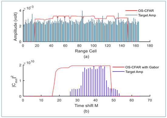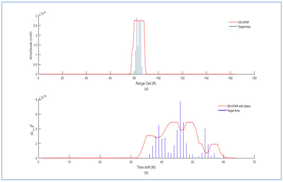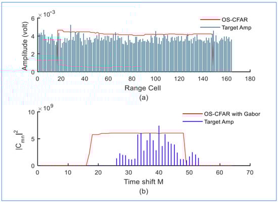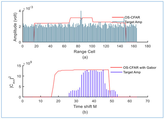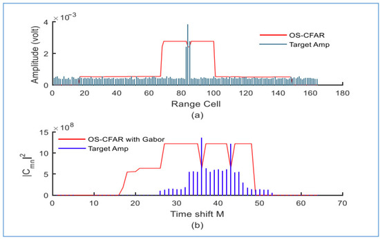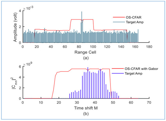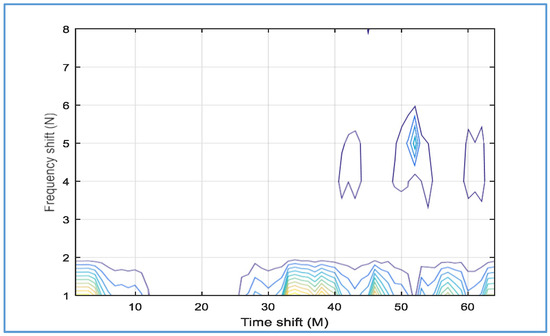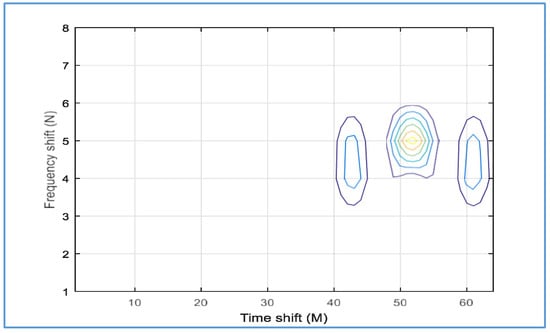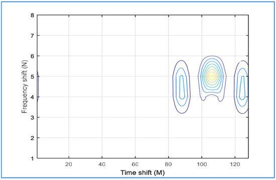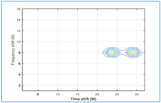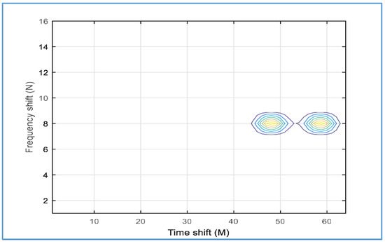We observe that the proposed detector fails to distinguish all targets within the same range when we decrease the temporal and frequency values of the Gabor transform to M = 32 and N = 16, respectively. Only two targets were distinguished with the proposed detector at M = 23 and M = 28, as shown in Figure 31.