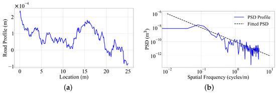 where is the roughness coefficient that represents the degree of roughness in the road classification ranging from Class A to Class H. In this study, is adopted as m3, which accounts for Class A profile in the road classification [56], = 0.1 cycles/m is the reference spatial frequency. = 0.01 cycles/m and = 10 cycles/m are the lower and upper spatial frequency limits, respectively. n is the spatial frequency value increased incrementally by = 0.01 cycles/m in the range between to . Road roughness irregularities are generated using the sum of a series of harmonics as described in Equation (2).