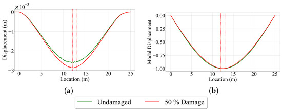 However, we will first take a step back and explain the physical principles of the methodology that will be utilized in the proposed framework. For this, we will discuss the components of the response of a bridge to a moving load (or vehicle). When the bridge is exposed to the dynamic loading applied by a moving load, there are three components to its response. The first one is the static response, which is the response created by the presence of the load at a certain location on the bridge. The other component is the dynamic response that is created by the movement of the load. These two components are present in the response of all bridges; damaged or undamaged. The third component is the damage component, that is visible only in the damaged bridges and close to the damage location. The damage component impacts both of the other two components of the bridge response; the static component and the dynamic component. However, the main impact of the damage component is on the static component while its effect on the dynamic component is much more subtle. For example, Figure 3a shows the displacement response of the bridge both in its undamaged and damaged states. The depicted displacement response is computed separately for each point on the span at the instant the back axle is exactly at that point. For comparison, Figure 3b depicts the first mode shape of the undamaged and damaged bridges, which have frequencies of Hz and Hz, respectively. Comparing Figure 3a,b, and considering that the change in the first mode frequency is relatively small, it is clear that the impact of the damage is mostly visible on the static response while its impact on the mode shape remains imperceptible.