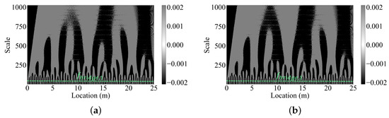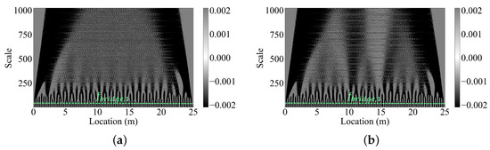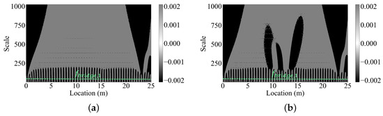 The wavelet coefficient maps of the residual accelerations obtained by subtracting the accelerations recorded at the rear-axle from those recorded at the front-axle for the undamaged and damaged bridges are shown in Figure 8. Comparing Figure 8 with Figure 4 and Figure 6, we can observe that the approach utilized to remove the road roughness effects indeed leads to a wavelet coefficient map that is closer to that obtained from a vehicle crossing a bridge that has a smooth surface rather than that obtained from a bridge with road roughness. Particularly, the WCM of the residual accelerations on an undamaged bridge in Figure 8a demonstrate that the effect of road roughness is minimized at scales greater than 300, which is the region of interest for us. As such, once we plot the WCM of the residual accelerations recorded on a damage bridge (Figure 8b), the damage leads to disturbances in the WCM at the higher scales that are clearly visible on the WCM.