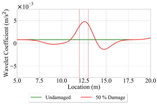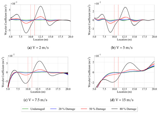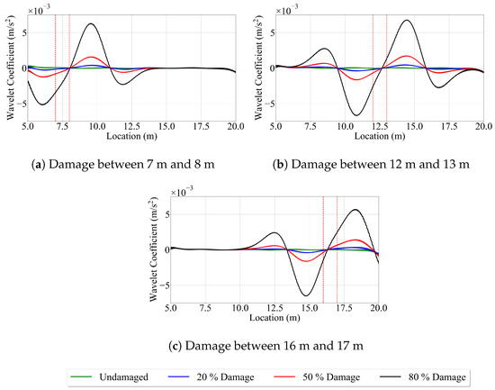 In Figure 11, the damage location is marked by red-colored vertical dashed lines, and, for each damage location, the wavelet coefficients were plotted for the different damage levels. The wavelet coefficients for the undamaged case remain relatively stable at zero. On the other hand, induced damage creates a clear perturbation in the wavelet coefficient around the damage location, while they revert to zero once the vehicle travels away from the damage. As such, presence of damage can be successfully detected for each damage location and each damage level depicted in Figure 11. Further, the disturbances in the wavelet coefficients follow the unique pattern explained in Figure 11. Accordingly, the wavelet coefficients reach a negative peak before the damage location, start to increase crossing the horizontal axis close to the middle of the damaged segment on their path to a positive peak, which occurs after the damaged section. Hence, the location of the damage can successfully estimated for each damage location by the proposed method.