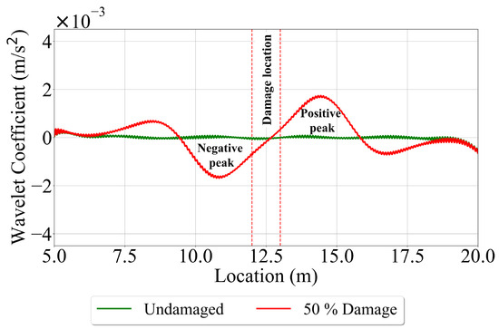 Based on this fact, Hester and Gonzalez [50,51] state that, for the case of direct monitoring, a horizontal section of the wavelet coefficient maps at a scale significantly higher than the scale corresponding to the first mode frequency of the bridge will be free from the dynamic response and closer to the static response. As such, Hester and Gonzalez [50,51] showcases that the wavelet coefficients taken at such high scales can be used to detect and locate damage.