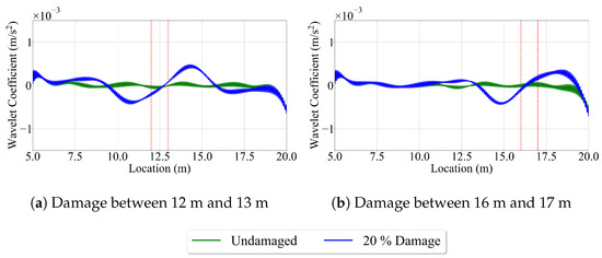 Further, the perturbations in the wavelet coefficient maps increase with an increase in the damage level paving the way for potentially quantifying the damage. However, this amplification in the perturbations with damage level, makes it difficult to visually identify the effect of damage on the wavelet coefficients when we plot all three damage levels in one plot. Therefore, we re-plotted the wavelet coefficients for the undamaged case and the damage between 12–13 m and 16–17 m cases in Figure 12. In this figure, we can clearly observe that, the wavelet coefficients for damage follows their counterparts for higher damage levels in Figure 11. Thus, we can confidently state that, the proposed framework can detect and locate damage for all damage levels and locations investigated.