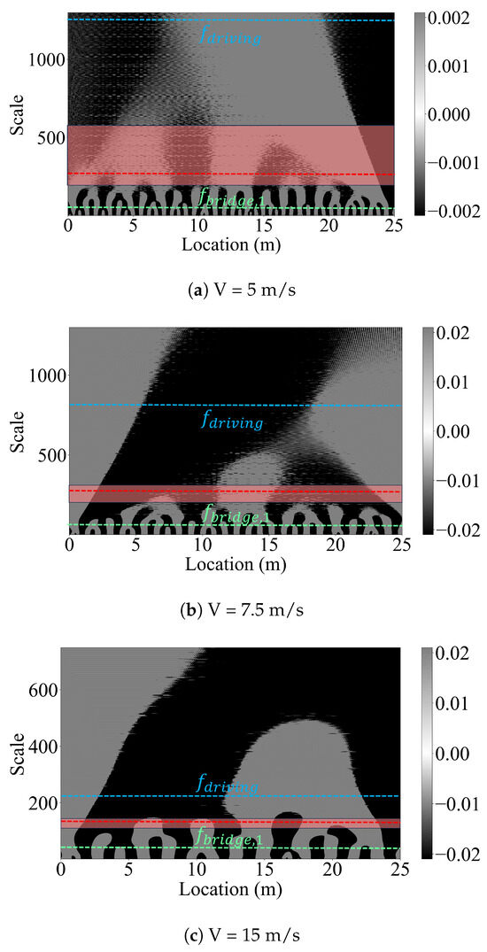 Next, we will take a look at the effect of vehicle speed on the accuracy of the proposed framework. The first immediate impact of the driving speed on the proposed framework is its effect on the driving frequency and the scale it corresponds to. As such, it is likely to alter the scale at which we take a horizontal section of the WCM. The shift in the scale corresponding to the driving frequency with the vehicle speed is demonstrated in the wavelet coefficient maps depicted in Figure 13 for different vehicle speeds. Recalling the procedure to select the scale where a horizontal section of the WCM will be taken, we first need to identify a range of scales which is sufficiently lower than the scale corresponding to the driving frequency and higher than the scales corresponding to the vehicle and the bridge frequencies. As shown in Figure 13 and also in Figure 10 for a speed of 2 m/s, which is not repeated here for brevity, this range is quite wide for lower vehicle speeds but gets narrower as the vehicle speed increases because the scale corresponding to the driving frequency decreases with increasing vehicle speed. Also depicted in the figure are the suitable ranges of scales for each vehicle speed to select the scale that will be used for damage detection and location. Accordingly, we selected the scales 600, 240, 240, and 185 for vehicle speeds of 2 m/s, 5 m/s, m/s, and 15 m/s, respectively, as indicated by the dashed, red lines in Figure 13.