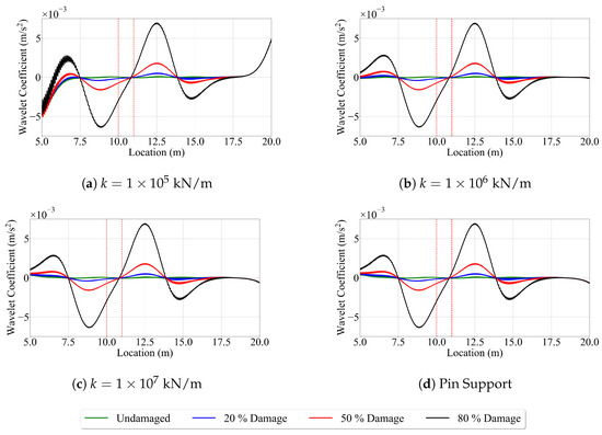 Figure 16 presents the wavelet coefficients at a scale of 600 computed from the residual accelerations recorded on a vehicle crossing a bridge with different boundary conditions. Comparing Figure 16a,d, which represent the softest and stiffest boundary conditions, respectively, we can observe that the edge effects associated with the continuous wavelet transform are distributed over a longer section of the bridge when the softest bearing stiffness is used. As a result, the section of the bridge where damage can be identified using the proposed method becomes more limited. More specifically, for bearing stiffness of kN/m and higher, it is possible to detect damage between 5 m and 20 m away from the left support. On the other hand, for kN/m, the wavelet coefficients become flat only when the vehicle reaches 7.5 m due to the edge effects limiting the possible damage detection to a portion of the bridge between 7.5 m and 17.5 m. When the damage is simulated between 10m and 11m, as is the case in this study, the disturbance in the wavelet coefficients around the damage location can clearly be identified for all three levels of damage leading to successful detection and localization of damage.
