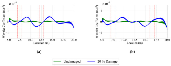 Damage in bridges is not necessarily confined to one portion of the bridge, but, especially if created by environmental conditions, can occur simultaneously at different sections. To investigate the efficacy of the proposed method to detect damage at multiple locations, we simulated two scenarios where damage is introduced at two separate sections. In the first scenario, damage is simulated between 7 m and 8 m and also between 12 m and 13 m measured from the left-hand support. In the second scenario, the damage is between 7 m and 8 m and between 16 m and 17 m. In both scenarios, we focused only on 20% damage because detecting and locating this damage level ensures that higher damage levels can also be detected and located. The numerical analysis was then repeated for both scenarios with road roughness, and the residual accelerations on the vehicle were computed. The vehicle speed was 2 m/s. Figure 17 depicts the variation of the wavelet coefficients with location at a scale of 600.