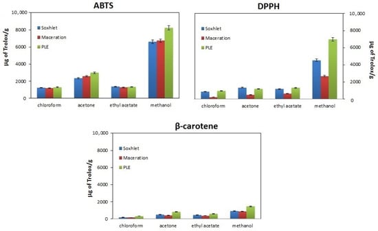 Comparison of the antioxidant properties of walnut husk extracts obtained by extraction in the Soxhlet apparatus (blue bars), maceration (red bars) and pressurized liquid extraction (PLE) (green bars) using different extractants (chloroform, acetone, ethyl acetate and methanol) and methods for assessing antioxidant properties (ABTS, DPPH and β-carotene).