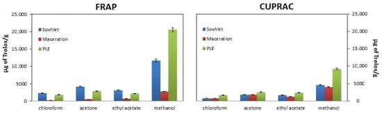 Comparison of the antioxidant properties of walnut husk extracts obtained by extraction in the Soxhlet apparatus (blue bars), maceration (red bars) and pressurized liquid extraction (PLE)(green bars) using different extractants (chloroform, acetone, ethyl acetate and methanol) and FRAP and CUPRAC methods for assessing antioxidant properties.