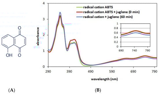 Structural formula of juglone (A). Spectra of the cation radical solution (green curve, Ao = 0.7) and the solution containing the cation radical ABTS (2900 μL, A0 = 0.7) and juglone (100 μL, c = 0.2 mg/mL); red curve—spectrum obtained at 0 min of reaction (immediately after mixing the ingredients) and blue curve—spectrum obtained after 60 min of reaction (B).
