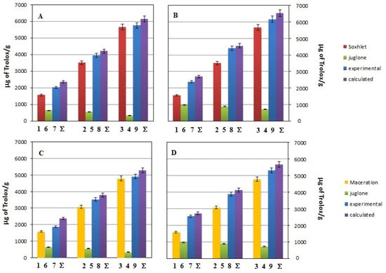 Changes of the antioxidant activity estimated by the ABTS assay for systems containing different volumes of methanolic Soxhlet extract (red bars) or methanolic macerate (yellow bars), and juglone solution (green bars) at concentration of 0.06 mg/mL (data in (A,C)) or 0.2 mg/mL (data in (B,D)). Violet bars labeled as “Σ” correspond to expected values of antioxidant activity for given system. The bar numbers correspond to the samples’ numbers from Table 2.