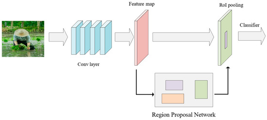 Faster R-CNN [28] represents a two-stage deep learning network designed for target detection, signifying an enhanced iteration within the R-CNN model lineage. The network achieves an end-to-end target detection process by incorporating a Region Proposal Network (RPN). The fundamental concept of Faster R-CNN involves segmenting the target detection process into two primary stages: candidate frame generation and target classification. In the initial step, RPN extracts candidate frames with varying proportions through a sliding window, generating location-sensitive bounding box offsets and corresponding confidence scores for each candidate frame. Subsequently, candidate boxes with high confidence are selected, transformed into fixed-size feature maps, and utilized for subsequent classification and location regression tasks. This transformation is executed via the RoI (Region of Interest) pooling layer. This two-stage architecture enables Faster R-CNN to significantly enhance detection speed while preserving target detection accuracy. With the integration of the RPN network, Faster R-CNN autonomously generates high-quality candidate frames, leading to more efficient and accurate performance in target detection tasks. The illustrated process is depicted in Figure 2.