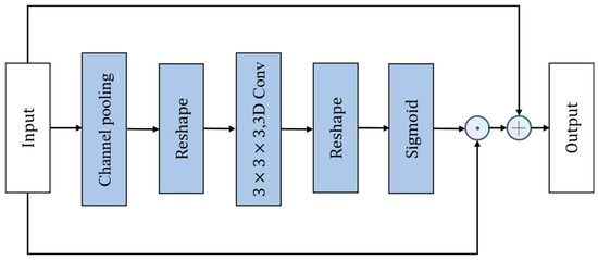 Traditional spatio-temporal feature extraction typically involves using 3D convolution, but directly employing 3D convolution significantly increases the computational load of the model. Therefore, the Spatio-temporal Excitation (STE) module first performs channel global pooling on the input tensor obtaining the corresponding channel-wise global spatio-temporal feature map , Subsequently, is reshaped into to make it compatible with 3D convolution operations. is then convolved with a kernel to produce the new spatio-temporal feature map . The output of this process can be expressed as follows: