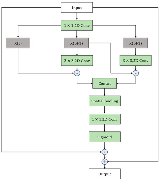 The motion excitation (ME) attention module begins with dimension reduction through a 1 × 1 convolution, followed by the computation of adjacent frame features using Equation (16). Here, represents the motion feature map, is a convolutional kernel, and represent the features of the current frame and the previous frame, respectively.