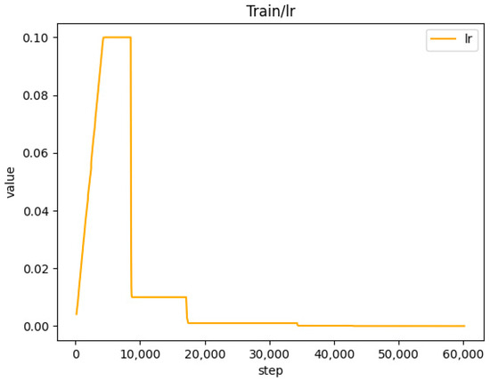 In this study, the experimental setup utilized the Ubuntu 18.04 operating system (Lenovo, Hohhot, Inner Mongolia, China), with a GPU (RTX 3090, 24 G) and a CPU (Intel(R) Xeon(R) Platinum 8338C). The software environment was configured with Python 3.8, CUDA 11.1, and PyTorch 1.8. The learning rate for network training was set to 0.1, employing the SGD optimization algorithm with a weight decay of 0.9. The learning rate was adjusted using the CosineAnnealingLR strategy, and other parameters included a Dropout of 0.5, a batch size of 8, and training for 70 epochs. The trend of learning rate reduction is illustrated in Figure 14.