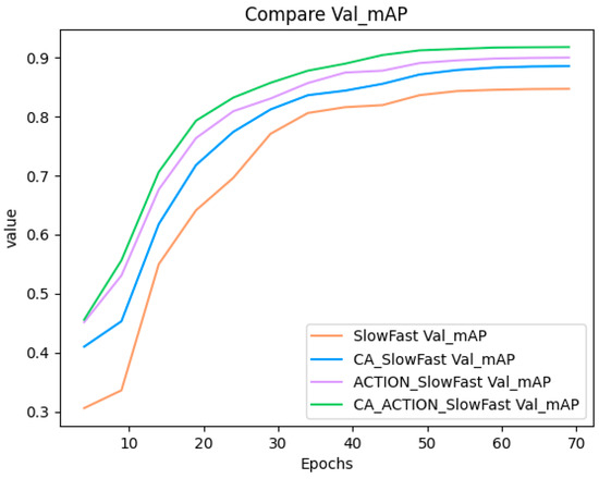 To comprehensively assess the performance of CA-ACTION-SlowFast in detecting manual labor behavior in the field, we select Slow Only, YOWO [39], and YOWOv2-Large [40] as comparative methods for the experiments in this study. Table 5 illustrates the outcomes of each methodology applied to our proprietary FWBD dataset, where mAP@0.5 denotes the mean Average Precision at an overlap area threshold (IoU) of 0.5 during computation.