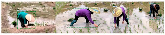 We conducted tests on realistic scenes of agricultural labor using the trained CA-ACTION-SlowFast model. Figure 16, Figure 17, Figure 18, Figure 19 and Figure 20 illustrate selected video frames after behavior detection with CA-ACTION-SlowFast in different scenes. In Figure 16, rice seedling transplantation in a rice field is depicted, while Figure 17 captures watering on land reclaimed for crop cultivation in a farm yard. Figure 18 showcases hoeing in a weedy field, Figure 19 portrays weed removal from the edge of the field, and Figure 20 demonstrates pesticide spraying in a vegetable field. The model consistently maintains high recognition accuracy across all scenarios, achieving remarkable performance, particularly in actions such as rice planting and hoeing where the target is not occluded. Even in backgrounds with an abundance of green plants, the model exhibits high recognition accuracy for weeding behavior, distinguishing it from pesticide spraying actions. This suggests that the model emphasizes human behavioral characteristics during feature extraction. The enhanced CA-ACTION-SlowFast model, augmented with the CA and ACTION modules, demonstrates robust adaptability across diverse scenarios. These improvements are anticipated to yield superior results in various practical applications.
