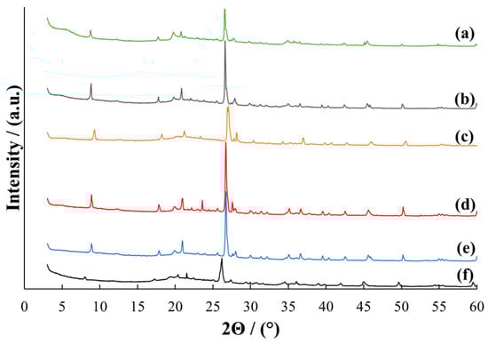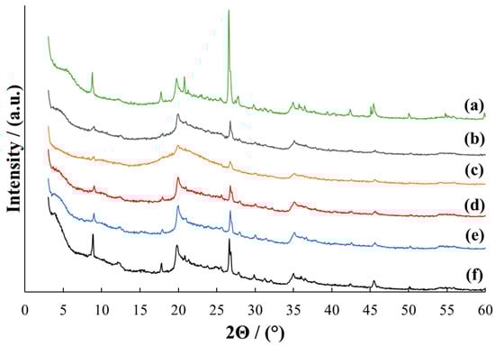 In the MMT/PVP-middle samples, all characteristic MMT reflections are slightly shifted towards larger 2Θ angles, regardless of the ratio of components (Figure 2, curves b–f). The appearance of these diffraction patterns differs from the pure MMT. Individual MMT reflections disappear, and PVP reflections appear. The intensity of M(001), M(002), and Q(101) reflections of these samples depends on the MMT/PVP ratio and is the highest for samples of pure MMT and MMT/PVP = 1:2. It can be argued that all MMT/PVP-middle samples have a flocculated structure (partially intercalated and exfoliated structure) [46] regardless of the initial ratio of components. It can be assumed that the MMT/PVP-middle = 3:1 contains the least amount of intercalated MMT. This is confirmed by the very low intensity of the M(001) reflection (Figure 2, curve c).