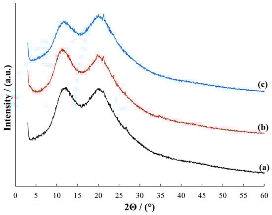 The diffractograms of samples MMT/PVP = 1:12 (Figure 3, curve a), MMT/PVP-top (Figure 3, curve b), and pure PVP (Figure 3, curve c) are almost identical. It is worth noting that the initial MMT/PVP ratio almost does not affect the appearance of the MMT/PVP-top diffractogram therefore Figure 3 shows only the diffractogram of the MMT/PVP-top at the MMT:PVP ratio 1:2. The M(001) reflection at 2Θ = 8.79°, which characterizes the interlayer space in MMT, is absent in the MMT/PVP-top and MMT/PVP = 1:12. This indicates almost complete exfoliation of MMT in these samples. However, it is possible to highlight some differences in the diffractograms of these samples. The diffraction pattern of the MMT/PVP-top sample (Figure 3, curve b) shows reflections M(110) at 2Θ = 19.72° and M(220) at 2Θ = 34.81°, which are characteristic of MMT at 2Θ = 19.77° and 2Θ = 34.91°, respectively (Figure 1, curve a). These reflections are absent in the PVP and MMT/PVP = 1:12, and in the MMT/PVP-top sample, they are shifted to the area of smaller 2Θ angles compared to pure MMT. In the MMT/PVP = 1:12 sample, there is a Q(101) reflection at 2Θ = 26.79° (Figure 3, curve a), which is characteristic of MMT at 2Θ = 26.59° (Figure 1, curve a). This reflection is absent in PVP and MMT/PVP-top. The reflection at 2Θ = 21.32° is present in the diffractograms of all three samples. Its intensity is highest in PVP and lowest in MMT/PVP = 1:12. Other analyses confirm these differences in the structure of the MMT/PVP-top and MMT/PVP = 1:12 samples. It can be assumed that this is due to different physical interactions between PVP macromolecules and MMT sheets in the samples.
