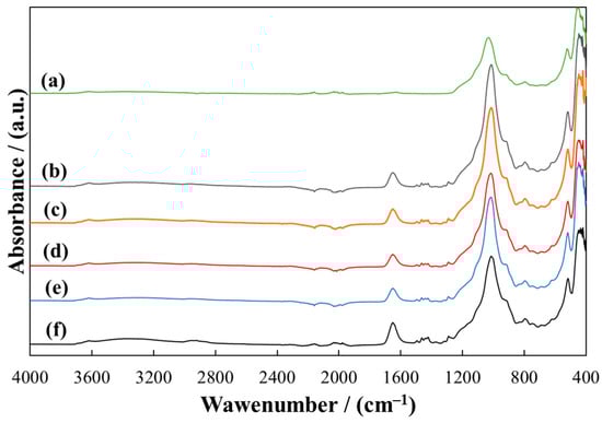 ATR-FTIR spectra of MMT (a) and MMT/PVP-middle at the MMT:PVP ratio 4:1 (b); 3:1 (c); 2:1 (d), 1:1 (e), 1:2 (f).