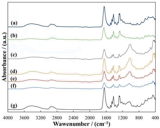 A detailed description of the FTIR spectra of pure PVP and MMT is presented in previous work [43]. The spectra of the MMT/PVP-bottom samples (Figure 4) are almost identical to the MMT/PVP-middle samples (Figure 5) regardless of the initial MMT/PVP ratio in the solution. In the spectra of these samples, in contrast to the sample of pure MMT (Figure 4 and Figure 5, curve a), new absorption bands appear in the range of 1652 cm−1 (C=O group), 747 cm−1 (CH2 group), and 1271 cm−1 (C–H group), which are characteristic of original PVP (Figure 6, curve b). These absorption bands’ position and relative intensity may vary slightly for different samples. In particular, in the spectra of MMT/PVP-middle samples, the relative intensity of these three absorption bands is higher than for MMT/PVP-bottom samples, which may indicate a higher content of PVP in MMT/PVP-middle samples. The change in the initial ratio of the components (MMT/PVP) practically does not affect the spectra of these samples, so it can be assumed that the content of MMT in the bottom and middle layers of the suspension does not depend on the initial ratio of MMT/PVP, but only affects the yield of products.