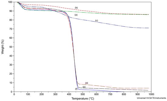 The thermal stability of the samples was investigated in a nitrogen atmosphere (flow rate of 60 mL/min) using a Q500 thermogravimetric analyzer (TA Instruments, New Castle, DE, USA). Samples weighing approximately 18 mg were heated to 1000 °C at a heating rate of 10 °C/min. The sample weight loss during heating was recorded (TG curves).