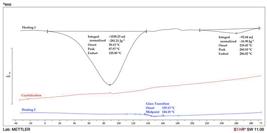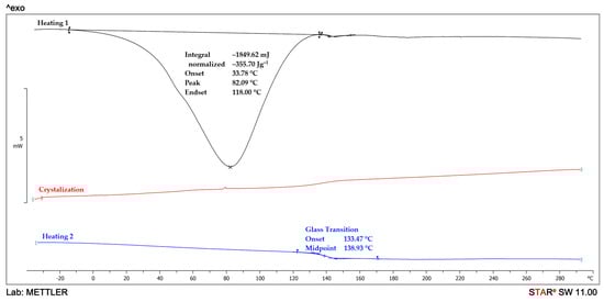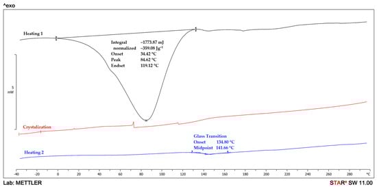 A differential scanning calorimeter type DSC 1 STARe System (Mettler Toledo, Columbus, OH, USA) was used to study the thermal behavior of the nanocomposites. DSC measurements were performed on samples weighing approximately 5 mg in a nitrogen atmosphere (flow rate of 50 mL/min). The studied samples were first heated from −40 to 300 °C, annealed at 300 °C for 3 min, then cooled to −40 °C and reheated to 300 °C. The sample heating-cooling rate was 10 °C/min. The second heating cycle was used to determine the glass transition temperature of the samples.