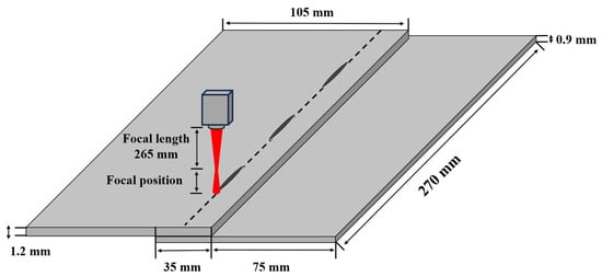 In this study, we used galvanized steel sheets (SGARC 340) as the base metals. The upper sheet had a thickness of 1.2 mm and dimensions of 270 mm (length) × 105 mm (width), while the lower sheet was 0.9 mm thick with the same dimensions. The mechanical properties and chemical compositions of the material are shown in Table 1. As shown in Figure 1, laser stitch welding was performed with a bead length of 20 mm and an overlap length of 35 mm.