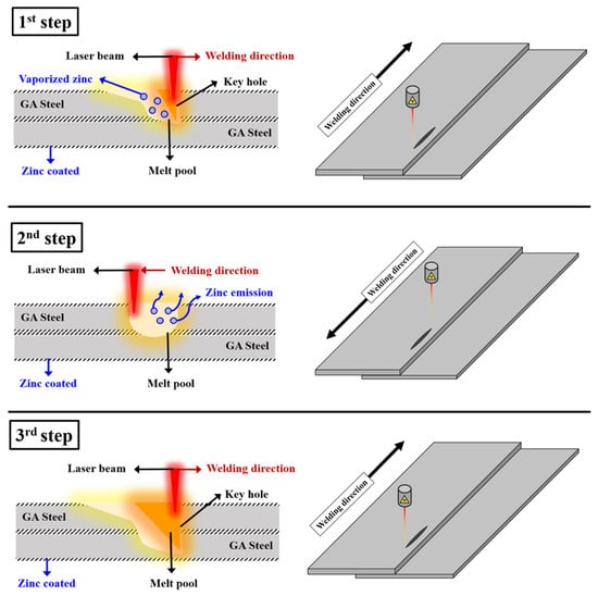 The laser stitch welding process for galvanized steel sheets devised in this study consists of a total of three steps, and a detailed step-by-step schematic diagram is shown in Figure 2. The first step involves using the laser in the partial penetration mode to remove the zinc plating layer from the welds and induce zinc vaporization by melting the material down to the top surface of the lower sheet. In the second step, the laser irradiation direction is reversed and returned to the starting position. This step releases the residual zinc and pre-heats the welds by irradiating a laser beam with relatively low power. The third step is performed using the full penetration mode, ensuring a penetration depth up to the appropriate thickness of the lower sheet of the material.