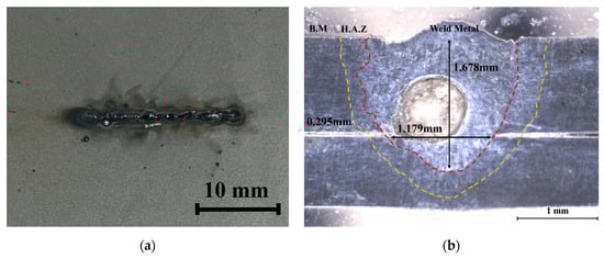 Bead appearance and cross-section of conventional laser welds: (a) bead appearance; (b) cross-section. B.M (Base Metal) refers to the area outside the yellow line. H.A.Z (Heat Affected Zone) denotes the area between the yellow and red lines. Weld Metal signifies the section inside the red line.