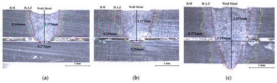 Cross-section of each step in the three-step laser welding process: (a) one-step process; (b) two-step process; (c) three-step process. B.M (Base Metal) refers to the area outside the yellow line. H.A.Z (Heat Affected Zone) denotes the area between the yellow and red lines. Weld Metal signifies the section inside the red line.