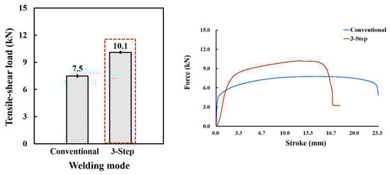 Comparison of tensile–shear load with different welding methods. The red dashed line indicates the welding mode.