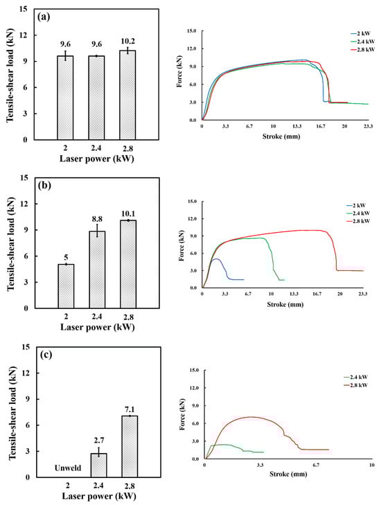 Comparison of tensile–shear load under different welding conditions during three-step laser welding: (a) focal position 20 mm; (b) focal position 25 mm; (c) focal position 30 mm.