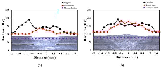 Hardness distribution with welding method: (a) hardness profile for conventional laser welds; (b) hardness profile for three-step laser welds.