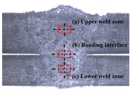 Comparison of the EDS spectrum with different welding methods: (a) upper weld zone; (b) bonding interface; (c) lower weld zone.