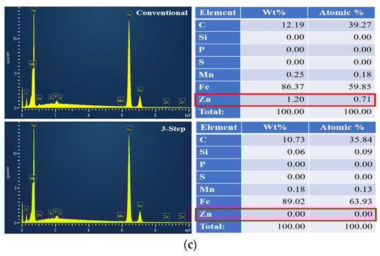 To confirm the zinc removal effect of the welds, SEM-EDS analysis was performed on the welds of both conventional and three-step laser welding. Figure 8 shows the location of the SEM-EDS measurement. Spot analysis was performed at a total of three points from the center of the welds to the upper sheet weld zone, welded bonding interface, and the lower sheet weld zone. This was performed under the conditions of the laser power of 2.8 kW and focal position of 20 mm with the highest tensile–shearing load. The component analysis results were classified into a, b, and c for each analysis location in Figure 9. For comparison, the measurement results of the conventional laser welds are shown on the left side of Figure 6, and the measurement results of the three-step laser welds are shown on the right side. The amount of zinc content at the bonding interface of the overlap joint on the galvanized steel sheet was 1.78% in the conventional laser welds and 0% in the three-step laser welds, indicating that the zinc removal effect could be quantitatively confirmed. In addition, the upper sheet weld zone, the bonding interface, and the lower sheet weld zone of the three-step laser welds all had 0% of the zinc content, whereas the amount of zinc content in conventional laser welds was, respectively, 1.41% of the upper sheet weld zone, 1.78% of the bonding interface, and 0.71% of the lower sheet weld zone. This is considered to be the case due to the fact that the zinc component melts and remains in the molten pool during the welding process.