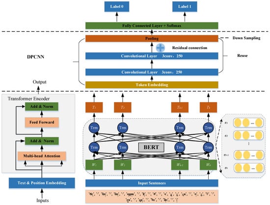 Early deep learning models mainly include Convolutional Neural Networks (CNNs) [] and Recurrent Neural Networks (RNN) []. TextRNN and TextCNN are model architectures for multi-label text classification problems. The TextRNN model adopts a Bi-directional Long Short-Term Memory (Bi-LSTM), where the input of the latter time step depends on the output of the previous time step, which cannot be processed in parallel and affects the overall process speed. TextCNN mainly relies on sliding windows to extract the features, which are limited in their ability to model long distances and are insensitive to the order of speech. Based on TextCNN, researchers propose the text recurrent convolutional neural network (TextRCNN []), in which the function of feature extraction in the convolutional layer is replaced by RNN, i.e., the feature extraction of TextCNN is replaced by an RNN. The advantage of RNNs is that it can better capture contextual information, which is conducive to capturing the semantics of long texts. Therefore, the overall structure becomes an RNN + pooling layer called RCNN. Based on TextCNN, Deep Pyramid Convolutional Neural Networks (DPCNN []) have been proposed, which is strictly the first word-level widely effective deep text classification convolutional neural network, which can also be understood as a more effective deep CNN.