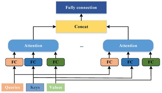 The multi-head attention mechanism is an extension of the attention mechanism, which independently calculates attention weights in multiple representation subspaces, allowing the model to learn different attention patterns in different subspaces, thereby improving the model’s representation ability. The attention mechanism creates three vectors before input: Query vector , Key vector , and Value vector . Attention is computed in three general steps: