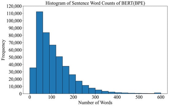 Frequency statistics of sentence length corresponding to the BERT (BPE) in this study.