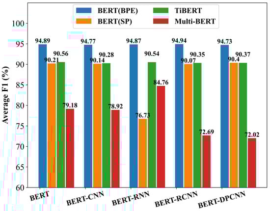 From Table 8 and Figure 4, it can be seen that there are specific differences in the average SBD indicators of the five models on the four pre-trained language models: BERT (BPE), BERT (SP), TiBERT, and Multi BERT. The performance of BERT (BPE) and TiBERT pre-trained language models is relatively stable, with the highest average performance on the BERT (BPE) model, followed by the TiBERT model, and the lowest average performance on Multi-BERT. BERT (BPE) outperforms other models by four percentage points. Table 7 shows that on the Multi-BERT model, the performance indicators become unstable with the increase in windows. We know that, during text segmentation and pre-training, other pre-trained language models include all Tibetan letters (30 consonants and four vowels). At the same time, the vocabulary in Multi-BERT only contains a portion of Tibetan letters. Therefore, during training, when segmenting the corpus, a lot of “[UNK]” will be generated, which significantly impacts understanding the text’s meaning.